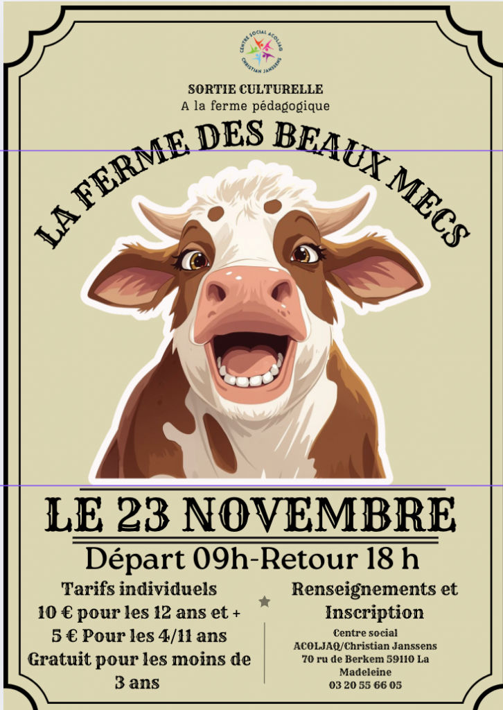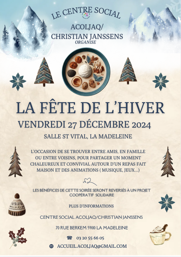 Diverses affiches sont produites pour les évènements proposés auprès des adhérents du centre social AColJAQ/Christian Janssens, et des habitants de La Madeleine.